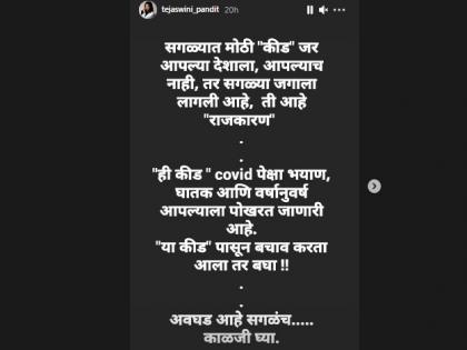 इन्स्टा स्टोरीवर तेजस्विनीने एक पोस्ट शेअर केली आहे. सगळ्यात मोठी ‘कीड’ जर आपल्या देशाला, आपल्याच नाही, तर सगळ्या जगाला लागली आहे, ती आहे ‘राजकारण’... ही ‘कीड’ कोविडपेक्षा भयाण, घातक आणि वषार्नुवर्षे आपल्याला पोखरत जाणारी आहे. या ‘कीड’पासून बचाव करता आला तर बघा! ..अवघड आहे सगळंच....काळजी घ्या,असे तिने या पोस्टमध्ये म्हटले आहे.