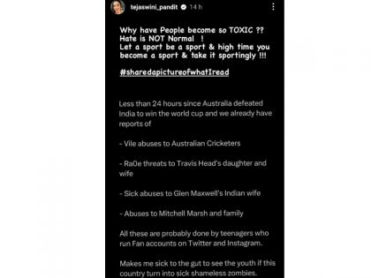 ऑस्ट्रेलिया क्रिकेटरच्या कुटुंबीयांना आक्षेपार्ह मेसेज करणाऱ्यांना तेजस्विनीने सुनावलं आहे. तिने इन्स्टाग्रामवर याबाबत एक पोस्ट शेअर केली आहे. यामध्ये मिशेल मार्शच्या कुटुंबीयांना, ट्रॅव्हिस हेडची मुलगी, पत्नी आणि ग्लेन मॅक्सवेलची भारतीय पत्नी यांना भारतीय चाहत्यांकडून आक्षेपार्ह मेसेज आल्याचं म्हटलं आहे. "जे मी वाचलं त्याचा फोटो शेअर करत आहे" असं म्हणत तेजस्विनीने पोस्ट लिहिली आहे.