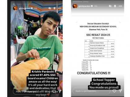 अभिनेत्यानं मुलाला मिळालेले गुण आनंदानं सोशल मीडियावर पोस्ट करीत त्याच कौतुक केलं आहे. गिरीश परदेशीनं लेक क्रिशिवनं ९७.४० टक्के इतके गुण मिळवले आहेत. लेकाची गुणपत्रीका सोशल मीडियावर पोस्ट करत कॅप्शनमध्ये अभिनेत्यानं लिहलं, "अभिनंदन, तुझा आम्हाला खूप अभिमान आहे". शाळेत चौथा आल्यानंतर क्रिशिवचं शाळेच्या बोर्डावर नाव झळकलेलं पाहायला मिळालं.