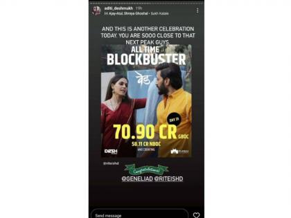 पठाणचाच सगळीकडे बोलबाला असतानाही वेडने आतापर्यंत जगभरात ७० कोटी ९० लाख रुपये कमाई केली आहे. तर देशभरात ५८ कोटी ११ लाख रुपये कमावले आहेत. वेडला मिळत असलेले यश पाहून रितेशची वहिनी म्हणजेच त्याचा भाऊ अमित देशमुख यांच्या पत्नी अदिती देशमुख यांनी स्पेशल पोस्ट शेअर केली आहे. अदिती देशमुख यांनी म्हटले की, आज आणखी एक सेलिब्रेशन आहे. तुम्ही पुढील यशाच्या शिखराच्या अगदी जवळ आला आहात. त्यांची ही पोस्ट पाहून जिनिलिया आणि रितेशने आभार मानले.
