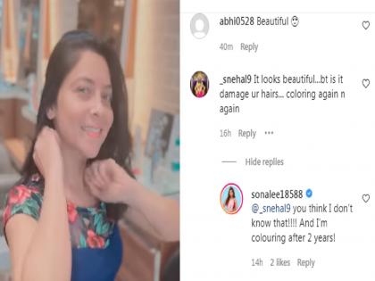 तिच्या या व्हिडीओवर अनेक कमेंट्स पडल्या. यापैकी एक कमेंट मात्र सोनालीला चांगलीच खटकली. ‘केस सुंदर दिसताहेत. पण वारंवार कलर केल्यामुळे केस खराब होतात,’ अशी कमेंट एका युजरने केली. सोनालीनं लगेच या कमेंटवर उत्तर दिलं. ‘तुला काय वाटतं मला एवढी साधी गोष्ट ठाऊक नाही आणि हो, 2 वर्षानंतर मी कलर करतेय,’ असं सोनाली त्यावर म्हणाली.