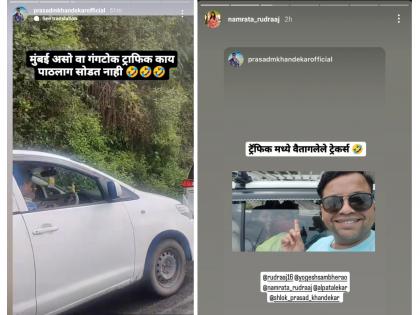 प्रसाद खांडेकरने इन्स्टाग्रामवर खास फोटो शेअर केले आहेत. यात गंगटोकची वाहतूक कोंडी दिसून येत आहे. या फोटोला कॅप्शनमध्ये लिहलं, 'मुंबई असो वा गंगटोक ट्राफिक काय पाठलाग सोडत नाही'. तर दुसऱ्या एका फोटोमध्ये प्रसाद खांडेकर गाडीच्या बाजूला दिसून येत आहे. गाडीमध्ये प्रसादचं कुटुंब बसलेलं पाहायला मिळतेय. या फोटो दिलेल्या कॅप्शनमध्ये त्याने लिहलं, 'ट्राफिकमध्ये वैतागलेले ट्रेकर्स'. ही पोस्ट प्रसादने त्याची पत्नी अल्पा खांडेकर, अभिनेत्री नम्रता संभेराव, तिचे पती योगेश संभेराव आणि त्यांचा मुलगा रुद्राज यांना टॅग केलं आहे.