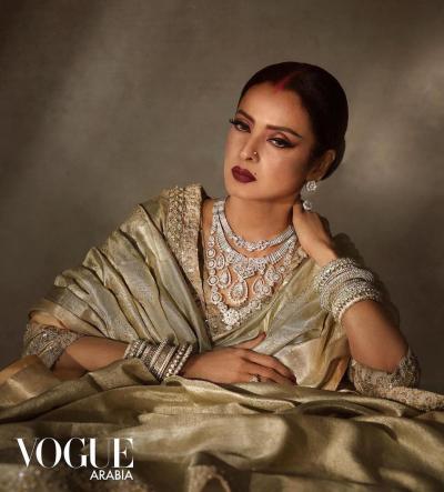 रेखा यांनी या फोटोशूटमध्ये डार्क रंगाची लिपस्टिक, भांगेत कुंकू आणि गोल्डन रंगाच्या साडीसोबत हेवी डायमंड ज्वेलरी परिधान केली आहे.