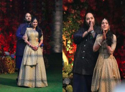 तर, अनंत अंबानी यावेळी निळ्या रंगाच्या शेरवानीत दिसला. या दोघांनी एकमेकांसोबत आणि कुटुंबीयांसोबत पोजही दिल्या.