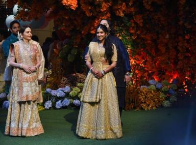 या प्रसंगी नीता अंबानी गोल्डन आणि क्रीम कॉम्बिनेशनच्या रेड बॉर्डरच्या साडीवर दिसल्या. तर मोठी सून श्लोका लाइट ब्लू कलरच्या लेहेंग्यात अत्यंत सुंदर दिसत होती.