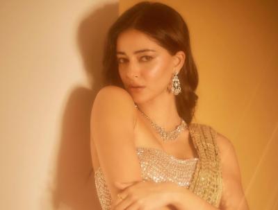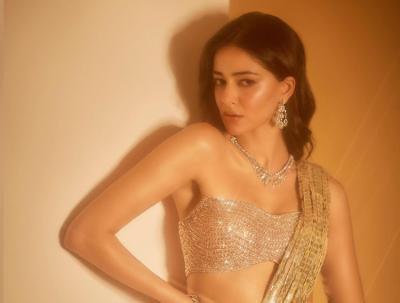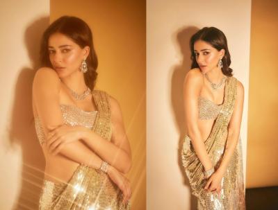 अनन्या पांडे गोल्डन साडीवर डायमंड ज्वेलरी परिधान केल्यानं तिच्या लूकमध्ये आणखी भर पडली.