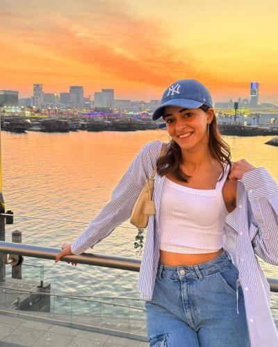 स्काय ब्लू ओपन शर्ट, लो वेस्ट जिन्स आणि व्हाइट इनर त्यावर डेनिम कॅप अशा वेस्टर्न लूकमध्ये अनन्या दिसली होती.