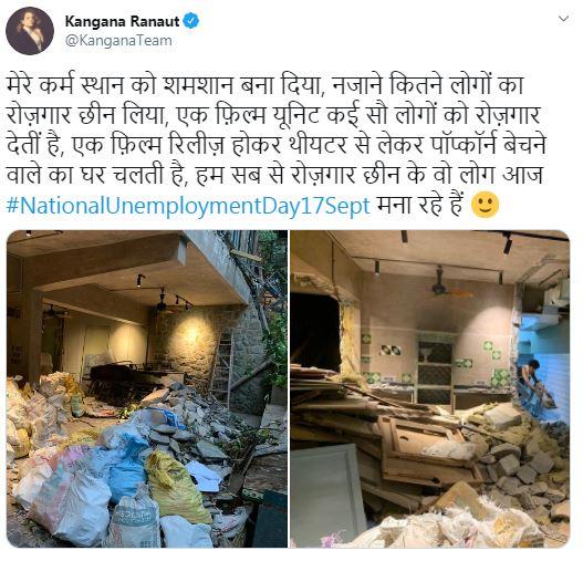 कंगना म्हणाली होती की, 'तिच्याकडे आता हे घर पुन्हा बांधण्यासाठी पैसे नाहीत. ती या पडक्या ऑफिसमधूनच काम करेल'.