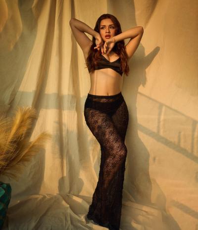 अवनीत कौरने काळी ब्रा घातली आहे आणि खाली मॅचिंग नेट स्कर्ट आहे. त्यामध्ये ती विविध प्रकारच्या आकर्षक पोज देत आहे.