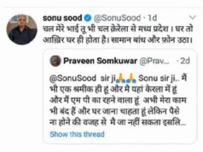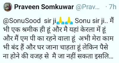 लॉकडाऊन दरम्यान, केरळच्या कोची येथे अडकलेल्या छिंदवाडा येथील रहिवासी प्रवीण सोमकुंवरला अभिनेता सोनू सूदने मदतीचे आश्वासन देऊन घरी पाठवण्याची तयारी केली होती.