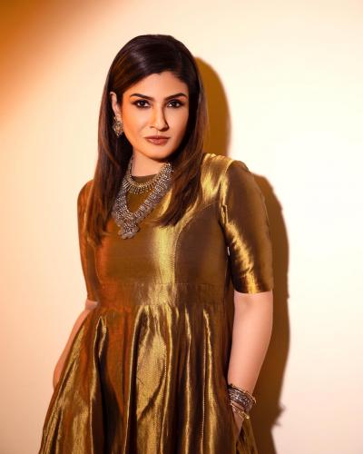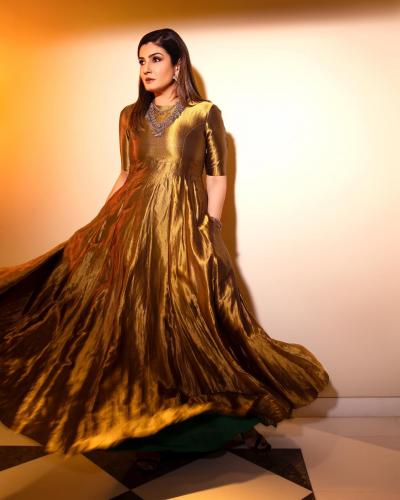 नुकतेच रवीनाने इंस्टाग्रामवर गोल्डन ड्रेसमधील काही फोटो शेअर केले आहेत. यात ती खूप सुंदर दिसते आहे. (फोटो: इंस्टाग्राम)