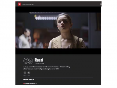 'राझी' हा चित्रपट पाकिस्तानात केवळ एक-दोन दिवसांपासून चर्चेत नाहीये. मिळालेल्या माहितीनुसार, हा चित्रपट गेल्या ३ आठवड्यांपासून सातत्याने नेटफ्लिक्सच्या 'टॉप १०' यादीत आपले स्थान टिकवून आहे.
