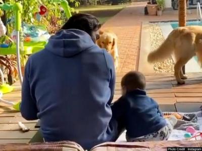 फोटो पाहून असं वाटतंय की अर्जुन आपल्या छोट्याला गिटार वाजवताना दिसतो आहे.