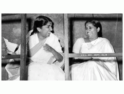 १९५६ मधील एका खास फोटोमध्ये लता मंगेशकर यांच्यासोबत 'बसंत बहार'च्या रेकॉर्डिंगदरम्यान त्या दिसतात. दोन्ही बहिणींचा हा क्षण संगीतप्रेमींसाठी खास आहे.