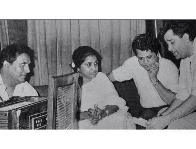 आशा भोसले संगीतकार शंकर-जयकिशन आणि दिग्दर्शक राज कपूर यांच्यासोबत दिसत आहेत. हा फोटो 'मेरा नाम जोकर' चित्रपटाच्या रिहर्सलदरम्यानचा असल्याचं सांगितलं जातं.
