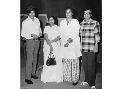 या फोटोत आशा भोसले यांच्यासोबत देव आनंद, किशोर कुमार आणि आर.डी. बर्मन दिसून येत आहेत.