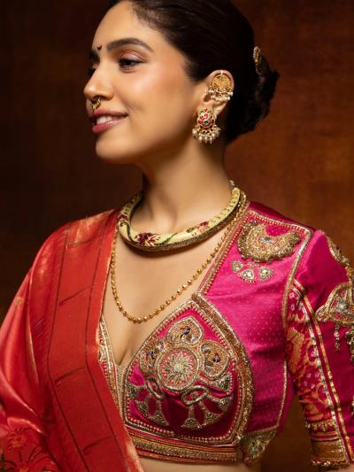 तिच्या ज्वेलरीने विशेष लक्ष वेधून घेतलं आहे. गळ्यात तिने चोकर आणि एक मोहनमाळ घातली आहे. तर कानात छान कानातले घातले आहेत.