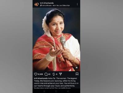 अभिनेत्री क्रिती खरबंदाने आशा भोसले यांच्या निधनानंतर धक्का बसल्याची भावना व्यक्त केल्या आहेत. तिने सोशल मीडियावर आशाताईंचा फोटो शेअर करत लिहिलंय, आशाताई. ती महान स्त्री. त्या लेजेंड होत्या.आज स्वर्गलोकी आनंदोत्सव सुरू आहे; तर इहलोकी मात्र तुमच्या जाण्याने दुःखाचे आणि विरहाचे काहूर माजले आहे. तुमच्या संगीताच्या आणि तुमच्या रूपाने तुम्ही आमच्या हृदयात सदैव जिवंत राहाल. तुमच्यासारखा कलाकार ना कधी झाला, ना कधी होईल."
