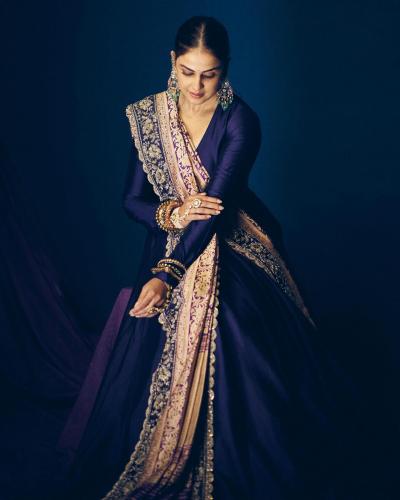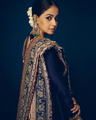 जिनिलीयाने निळ्या रंगाचा अनारकली ड्रेस परिधान केला आहे. यावर तिने डिझायनर ओढणी घेतली आहे.