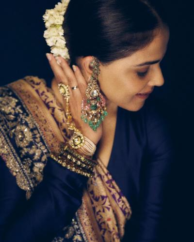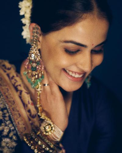 कानात मोठे खड्यांचे कानातले, खड्यांची ज्वेलरी घालत तिने केसांत गजरा माळला आहे. यामुळे तिच्या सौंदर्यात भर पडली आहे.