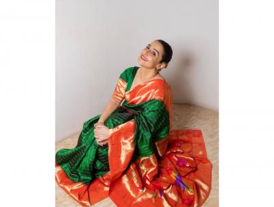 विद्या बालनने हिरव्या पैठणीसह भगव्या रंगाचा पदर असलेली सुंदर साडी नेसली आहे. साडीमधील नक्षीकाम आणि पारंपरिक दागिन्यांसह विद्याचा खूप देखणा आणि पारंपरित वाटतोय.