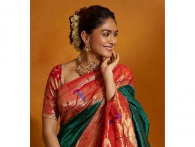हिरवी साडी, लाल रंगाचा पदर आणि त्यावर मोराची नक्षी असलेली साडी मृणाल ठाकूरवर खूप खुलुन दिसतेय. मृणाल ठाकूरने परिधान केलेली नथ तिच्या लूकवर खुलून दिसतेय.