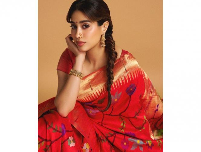 जान्हवी कपूरची लाल पैठणी साडी खूपच आकर्षक आहे. मॉडर्न ब्लाऊज आणि सॉफ्ट मेकअपमुळे जान्हवीचा लुक खास ठरतो. जान्हवी मॉडर्न आणि ट्रेडिशनल आउटफिटमध्ये किती सुंदर दिसते, हेच यातून पाहायला मिळतं.
