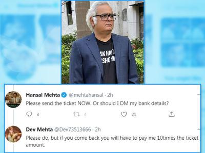 हंसल मेहता यांनी यावर तिकीट पाठव... पाहिजे तर मी माझे बँक डिटेल्स देतो असे उत्तर दिले. त्यावर या युझरने रिप्लाय केला की, मी तिकीट पाठवतो. पण तुम्ही परत आलात... तर तुम्हाला तिकिटाच्या किमतीच्या दहा पट अधिक पैसे मला परत करावे लागतील. (फोटो: ट्विटर)