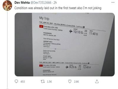 त्यावर युझरने मुंबई ते दुबई, दुबई ते कराची असे बुकिंग करत त्याचा स्क्रीन शॉर्ट सोशल मीडियावर शेअर केला. (फोटो: ट्विटर)