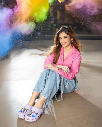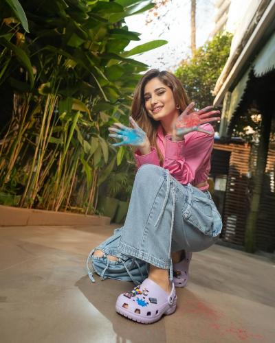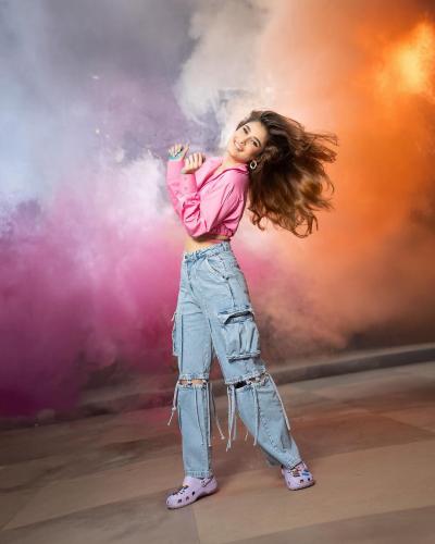 गुलाबी शर्ट, त्यावर निळ्या रंगाची जिन्स आणि हवेत उडालेला सुका रंग असं देखणं फोटोशूट तिने केलं आहे.