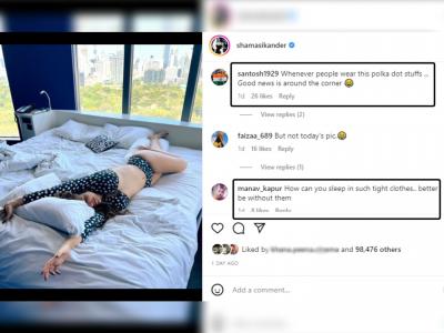 शमा सिकंदरने पोल्का डॉट ब्लॅक अँड व्हाइट बिकिनीमधला तिचा फोटो शेअर केला. त्या फोटोत ती खूपच हॉट दिसत होती. एका फोटोमध्ये शमा बिकिनी घालून बेडवर झोपली होती. त्यावर एकाने लिहिले- 'हे खूपच चीप वाटतंय'. तर दुसऱ्याने उपहासाने लिहिले की- 'इतके घट्ट कपडे घालण्यापेक्षा सगळंच काढून टाका' तर आणखी एकाने लिहिलं की असे पोलका डॉटवाले कपडे कुणी घातले की असं वाटतं लवकरच गूड न्यूज मिळेल!