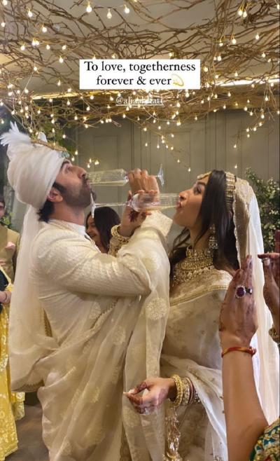रणबीर कपूर व आलिया भट या बॉलिवूडच्या क्यूट कपलनं काल लग्नाच्या आणाभाका घेतल्या. क्यूट कपलचे लग्नाचे फोटो तुम्ही पाहिले असतीलच. आता या लग्नाचे इनसाईड फोटो समोर आले आहेत. (pic-Alia Bhatt Instagram)