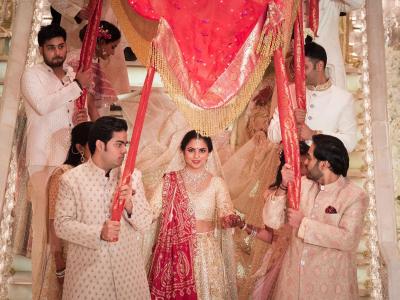 लग्नमंडपात एन्ट्री करताना ईशा. यावेळेस तिच्या भावांनी चहुबाजूंनी लाल रंगाची चादर पकडल्याचे दिसत आहे.