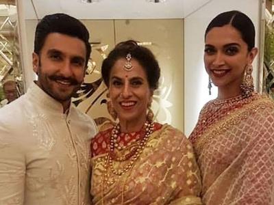 दीपिका पादुकोण आणि रणवीर सिंह पारंपरिक पोशाखात. दीपिकानं आकर्षक साडी तर रणवीरनं कुर्ता पायजमा परिधान केला होता.