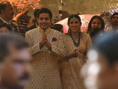 आकाश अंबानी आणि श्लोका पाहुण्यांचे स्वागत करताना