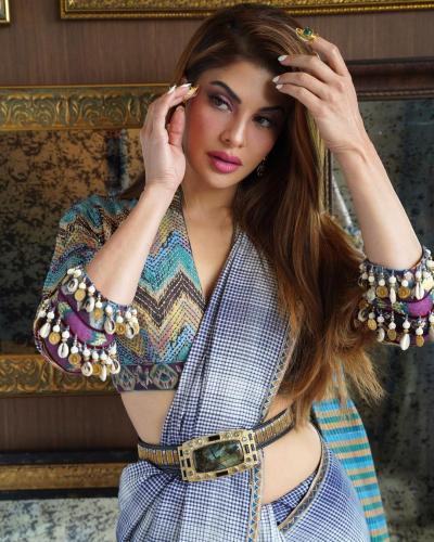 या फोटोंमध्ये जॅकलीनने ग्रे साडी नेसली आहे, ज्यावर तिने प्रिंटेड ब्लाउजसोबत मॅच केला आहे. (फोटो: इंस्टाग्राम)