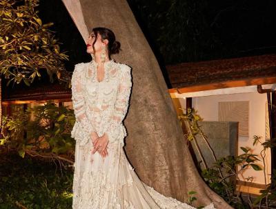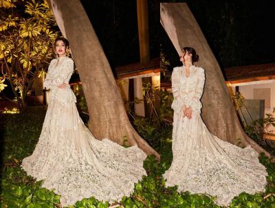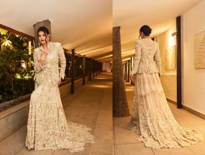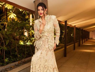 ऑफ व्हाईट रंगाच्या आऊटफीटवर काजलने मॅचिंग कानातले घातले आहेत.