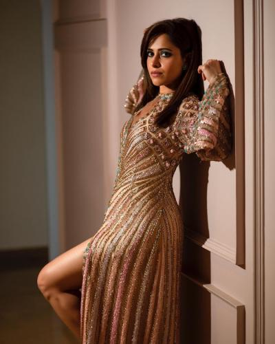नुकतेच तिने पिच रंगाच्या गाउनमधील फोटो शेअर केले आहेत.