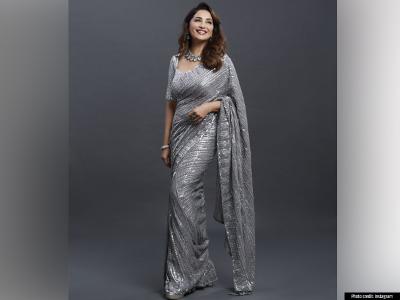 माधुरी दीक्षित सिल्वर रंगाच्या साडीमध्ये खूपच सुंदर दिसतेय. फोटोमध्ये ती वेगवेगळ्या पोझ देताना दिसतेय. (Photo Instagram )