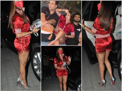 या पार्टीत मलायका नेहमीप्रमाणे अतिशय ग्लॅमरस अंदाजात पोहोचली होती. शाइनी रेड कलरचा शॉर्ट ड्रेस आणि सोबत मॅचिंग हायहिल्स शिवाय मॅचिंग मास्क तिने घातला होता.