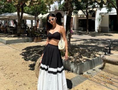 या फोटोंमध्ये मौनी रॉय काळ्या टॉपसह ब्लॅक अँड व्हाइट स्कर्टमध्ये दिसली.