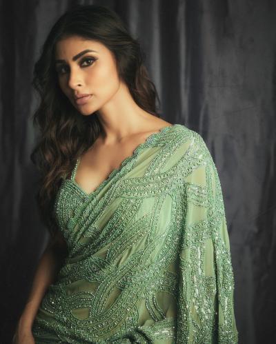 या फोटोंमध्ये मौनी ग्रीन कलरच्या साडीमध्ये फोटोशूट करताना दिसत आहे. (फोटो: इंस्टाग्राम)