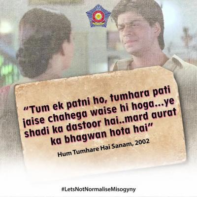 हम तुम्हारे सनम या चित्रपटातील हा डायलॉग बघा. तुम एक पत्नी हो, तुम्हारा पति जैसे चाहेगा वैसे ही होगा... ये शादी के दस्तूर है. मर्द औरत का भगवान होता आहे..., हा एक संवाद मुंबई पोलिसांनी शेअर केला आहे.