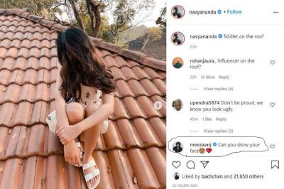 नव्याने इन्स्टाग्रामवर घरांच्या कौलावर बसलेला एक फोटो शेअर केला आहे. पण यात तिचा चेहरा केसांनी झाकलेला दिसतोय. यावर कमेंट करत, तू तुझा चेहरा दाखवू शकतेस का? अशी कमेंट मिजानने केली आहे. या कमेंटसोबत त्याने हार्ट इमोजीही पोस्ट केला आहे.