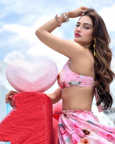 या फोटोंमध्ये नुसरत बेबी पिंक कलरच्या फ्लोरल प्रिंटेड लेहेंग्यात दिसत आहे. (फोटो: इंस्टाग्राम)