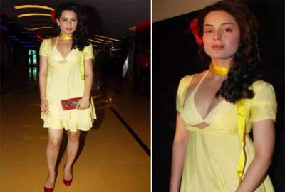 2009 साली एका इव्हेंटमध्ये जेव्हा कंगना पोहचली तेव्हा तिचा लूक पाहून सगळे हैराण झाले होते. यावेळी कंगनाने लेमन यलो रंगाचा स्पगेटी स्ट्रैप्स ड्रेस घातला होता. ज्याला प्लंजिंग नेकलाइन होती. या शॉर्ट ड्रेससोबत त्याच रंगाचा आणि नेकलाइन डिझाइनची ब्रा मॅच केली होती.