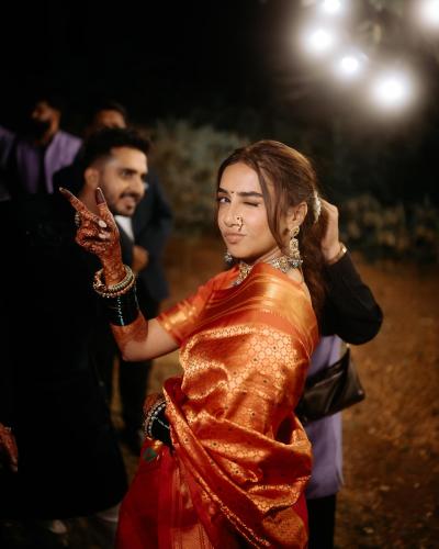 संगीत नाइटमध्ये प्राजक्ता कोळीने वेस्टर्न लूक ऐवजी मराठमोळा लूक केला आहे. या खास दिवसासाठी अभिनेत्रीने तिच्या आईची लाल रंगाची साडी नेसली आहे.