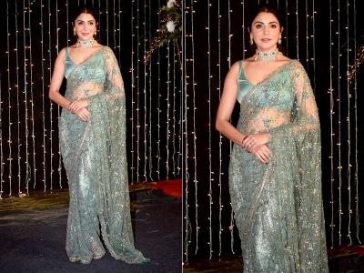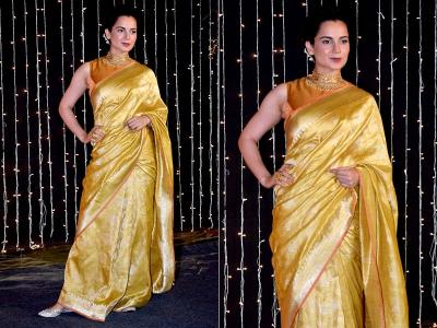 कंगना राणौत गोल्डन कलरच्या सिल्क साडीत या रिसेप्शनमध्ये पोहोचली. तिच्या अदा सगळ्यांन घायाळ करून गेल्या.