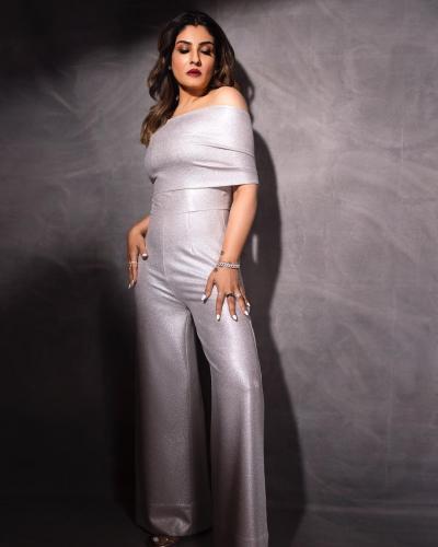 य फोटोशूटमध्ये रवीनाने एकापेक्षा एक पोझ दिल्या आहेत. सिल्व्हर कलरच्या जम्पसूटमध्ये ती प्रचंड ग्लॅमरस दिसतेय.