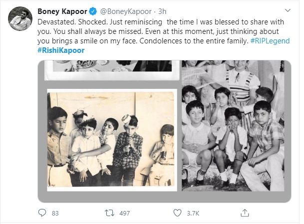 1 / 11अभिनेता ऋषी कपूर यांच्या निधनाने सर्वांनाच धक्का बसला आहे. बोनी कपूर यांनी ट्विटरवरु बालपणीचे फोटो शेअर करत ऋषी यांच्यासोबतच्या आठवणी जागवल्या. 2 / 11सुमिते कडेल यांनी आपल्या ट्विटर अकाऊंटवरुन एक व्हिडिओ शेअर केला, तसेच हा व्हिडिओ पाहून मी अश्रू थांबवू शकलो नसल्याचे त्यांनी म्हटलंय3 / 11अभिनेता आणि लिजेंड धर्मेंद्र देओल यांनीही ट्विटरवरुन भावुक प्रतिक्रिया देताना, आज रीषी भी चला गया... असे म्हटलंय.4 / 11गायक सलिम मर्चंट यांनी ऋषी कपूर यांनी गायलेल्या गाण्याचा एक व्हिडिओ शेअर करत त्यांना आदरांजली वाहिली.5 / 11दंगब स्टार सलमान खाननेही ऋषी कपूर यांच्याबद्दल लिहिताना कहा सुना माफ.. असं म्हणत त्यांना श्रद्धांजली वाहिली6 / 11अभिनेत्री सीमी गिरेवाल यांनीही ट्विट करुन माझा सर्वात जवळचा मित्र, माझा डार्लिंग गेल्याचं म्हटलंय7 / 11भाजपा खासदार आणि माजी क्रिकेट गौतम गंभीरनेही ऋषी कपूर यांना आदरांजली वाहत, लहानपणीची आठवण व्यक्त केली.8 / 11चित्रपट समिक्षक अनुपमा चोप्रा यांनी आपल्या आईच्या आठवणींना उजाळा देत ऋषी कपूर यांच्याबद्दलच्या भावना व्यक्त केल्या.9 / 11टीम इंडियाचा क्रिकेटर आक्रमक फलंदाज सुरेश रैनाही ट्विटरवरुन श्रद्धांजली वाहताना शोक व्यक्त केला.10 / 11बॅडमिंटनपटू सायना नेहवालनेही सर.. आम्ही तुम्हाला कायम मिस करु.. असे म्हणत शोक व्यक्त केला.11 / 11दक्षिण भारतीय इंडस्ट्रीतील स्टार महेश बाबू आणि अभिनेता व राजकीय नेता पवनकल्याण यांनीही दु:ख व्यक्त करत ही शॉकिग न्यूज असल्याचं म्हटलंय